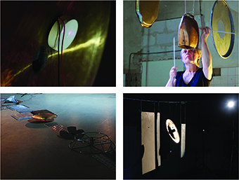 Mehrere Linien durchschneiden den Raum, auf dem Fußboden und in der Luft, ohne Rücksicht auf die üblichen Wege. An einer Wäscheleine hängen und am Boden liegen vielgestaltige Metallobjekte, die ungewohnte Sicht- und Hörachsen eröffnen. Sie werden durch Körperschallwandler angeregt, die Instrumentenklänge und Umweltgeräusche abspielen, und schwingen mit ihnen mit. Der gesamte Raum wird zum immersiven Resonanzraum aus Klang, Bild, Licht und Schatten, Realität und Imagination. In der Performance entwickelt sich das Geschehen vom Raumklang zur kammermusikalischen Improvisation mit E-Gitarre, Großer Trommel und Cello.